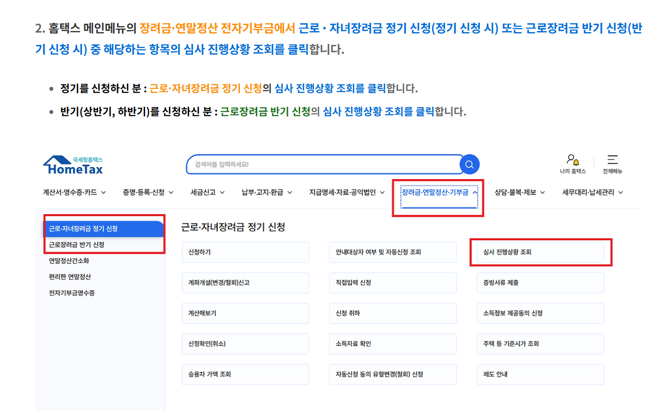 < 홈택스 메인메뉴의 장려금 연말정산 전자기부금에서 근로 자녀장려금 정기 신청 또는 반기 신청의 진행상황조회 클릭하기 >