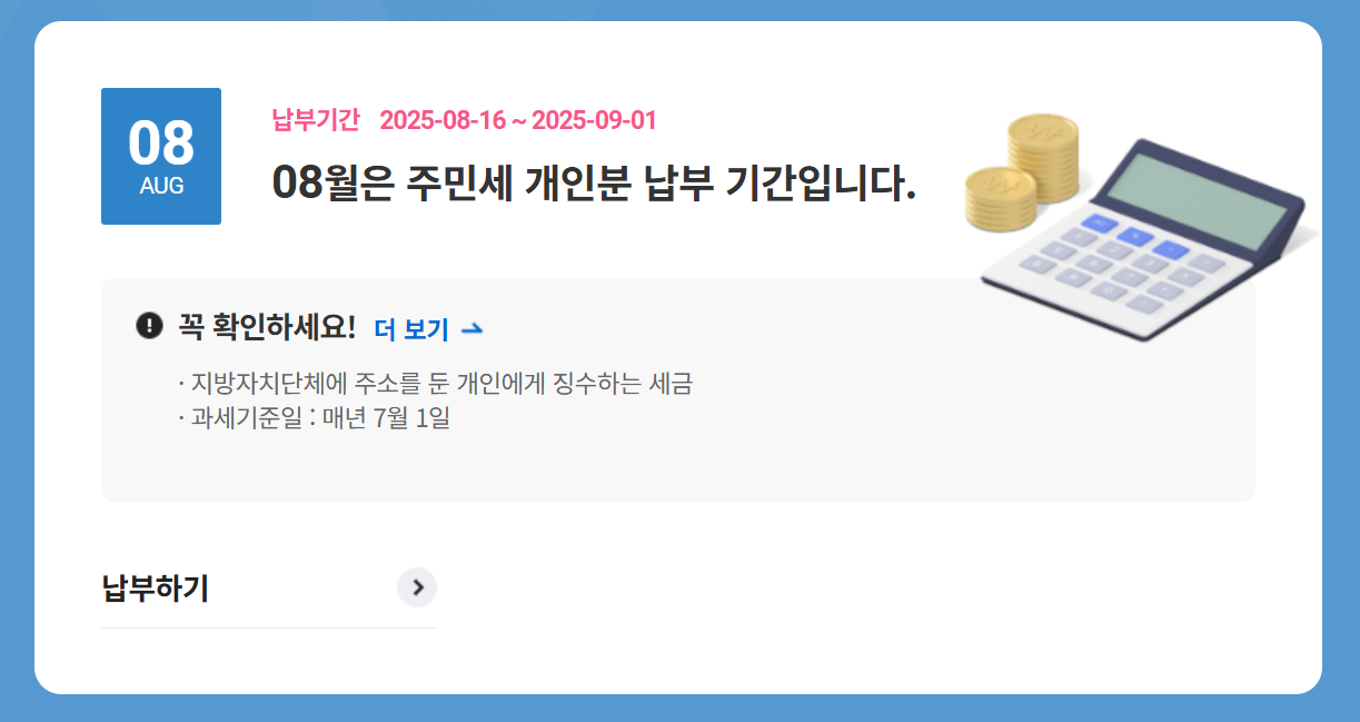 주민세 납부 기간은 매년 8월 16일부터 8월 31일까지입니다. 이 기간 안에 납부하지 않으면 가산금이 붙을 수 있으니, 꼭 기한 내에 납부해주세요!