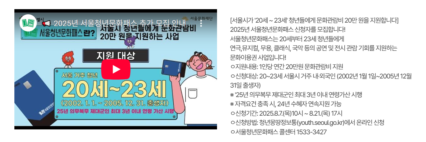 - 신청 및 이용자격 문의: 서울청년문화패스 콜센터 1533-3427