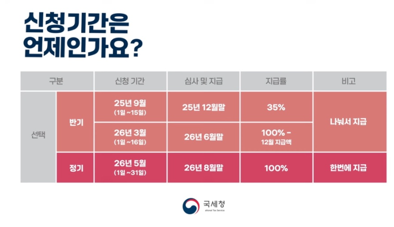 신청 기간: 매년 3월 1일 ~ 3월 15일 (직전년도 하반기 소득) / 9월 1일 ~ 9월 15일 (당해년도 상반기 소득)