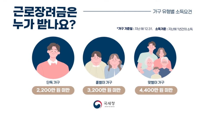 맞벌이 가구의 경우 연간 총소득이 4400만 원 미만이어야 합니다.