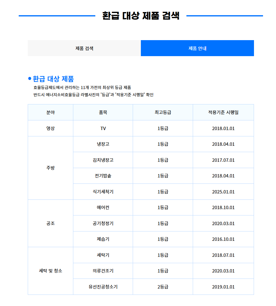 제품을 고를 때는 반드시 효율 등급 라벨이 1등급인지 확인해야 하며 온라인 구매 시에도 상세 설명에 1등급 표기가 있어야 합니다. 2등급 이하 제품이나 중고 가전 리퍼비시 제품은 환급 대상이 아닙니다.